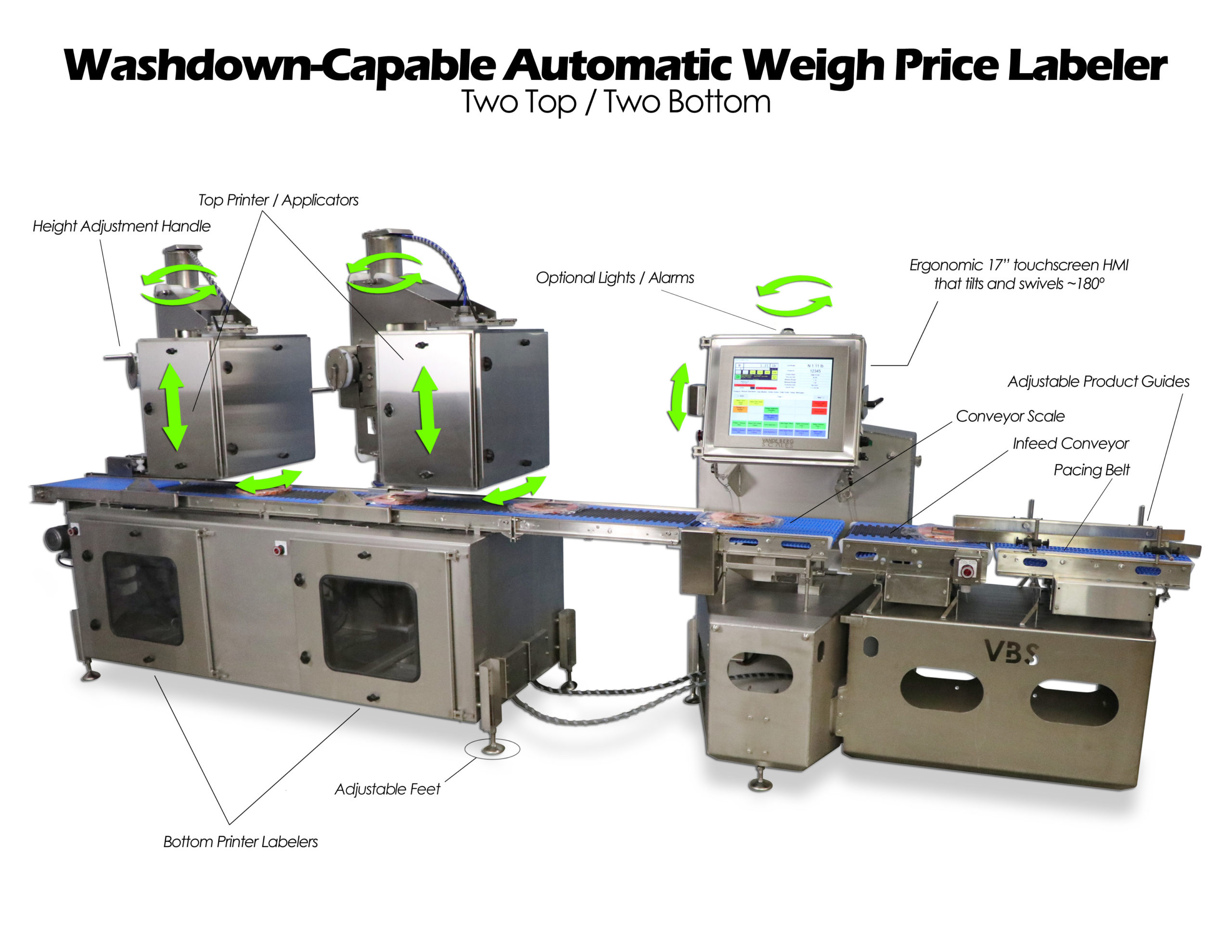 Introducing the industry’s first washdown automatic weigh price labeler! The result is less expensive component replacement from a washdown crew’s carelessness. Unit is made of 3/16″ SS plate, which is unrivaled in the WPL industry.